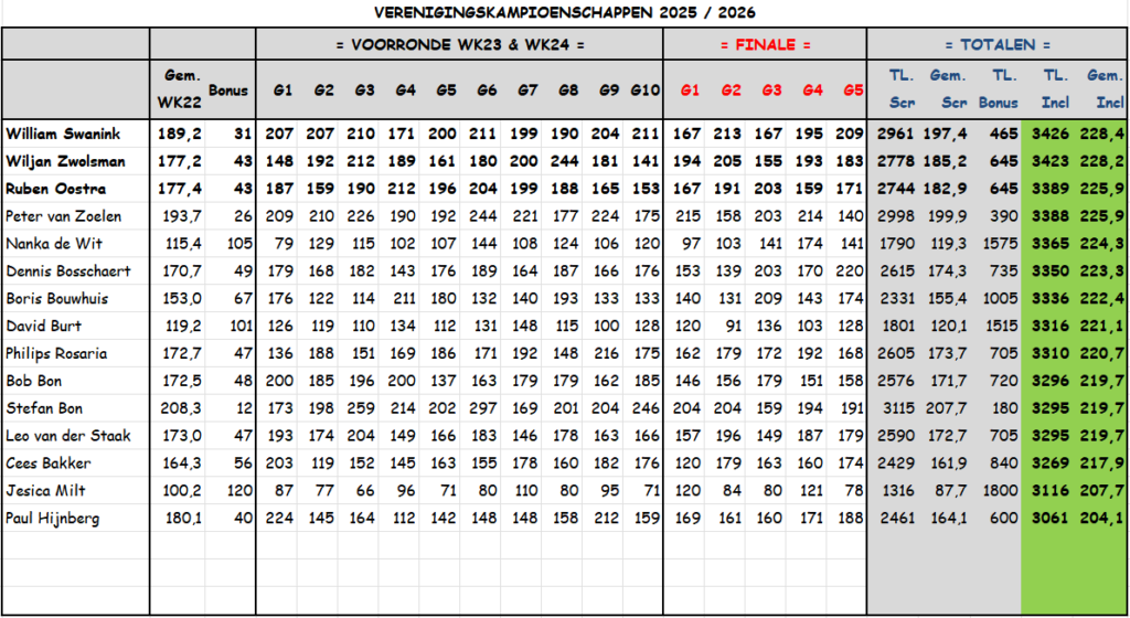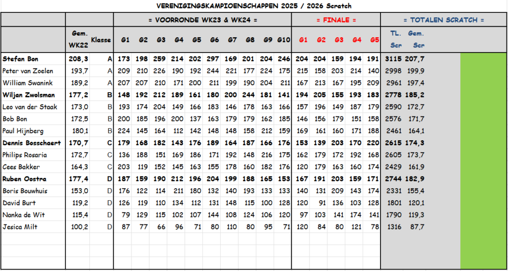 De scores van twee league avonden woden meegenomen als ‘voorronde’ van het toernooi. Op de finale dag zullen 5 games gespeeld worden om de winnaar te bepalen.